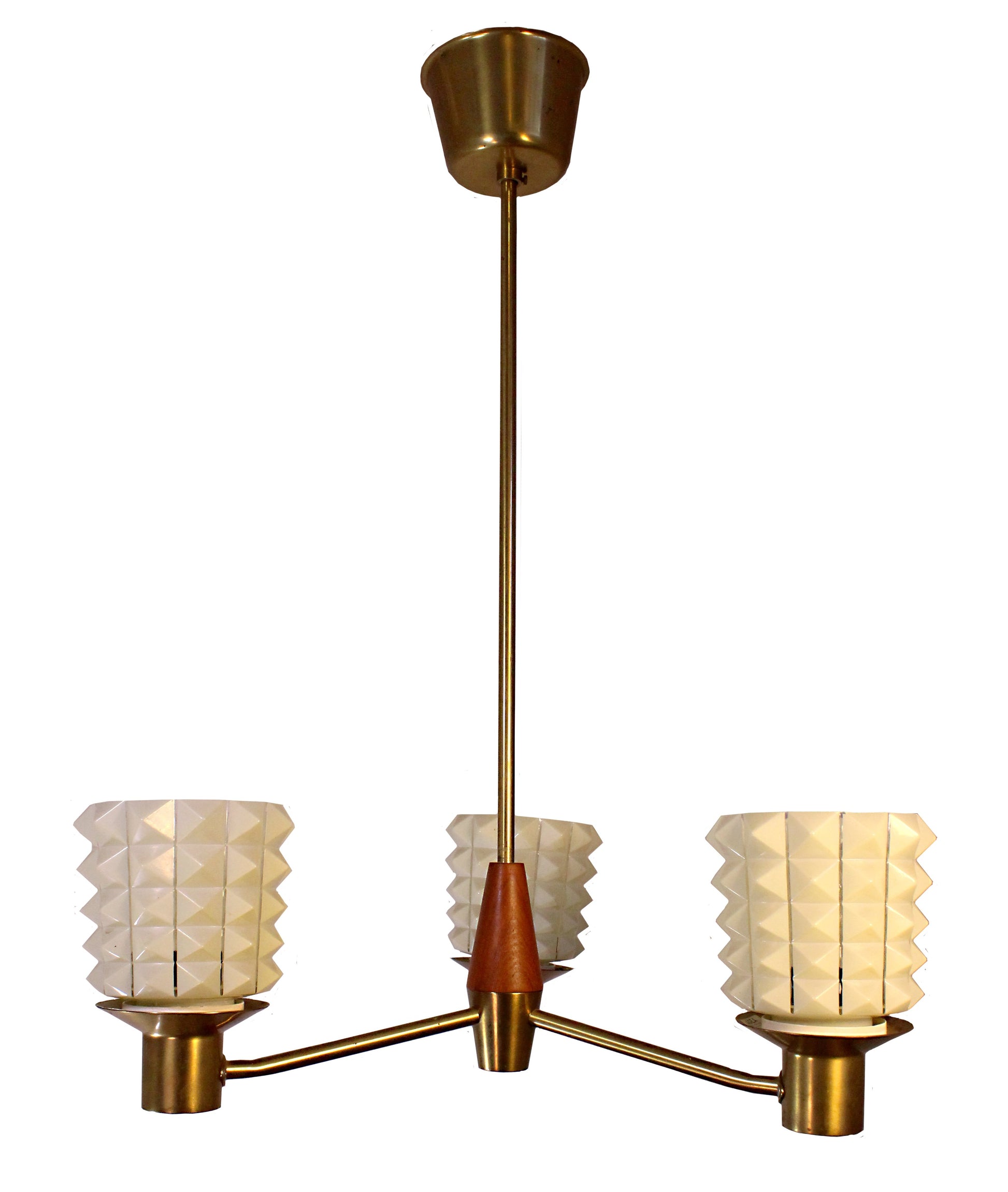 Trearmad, tillverkad i trä och mässing med ljusgula kupor.