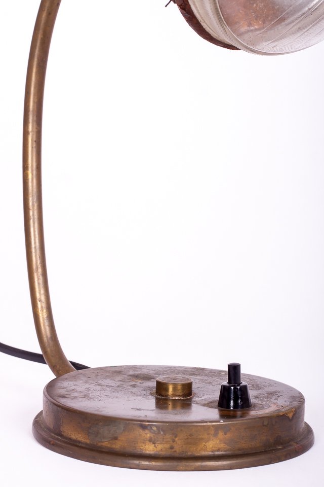 Fräck bordslampa monterad med en äldre billykta och lampstomme i mässing från tidigt 1900-tal